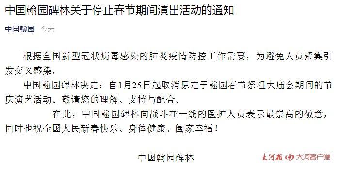 根据全国新型冠状病毒感染的肺炎疫情防控工作需要,为避免人员聚集引发交叉感染,中国翰园碑林决定:自1月25日起取消原定于翰园春节祭祖大庙会期间的节庆演艺活动。敬请您的理解、支持与配合。