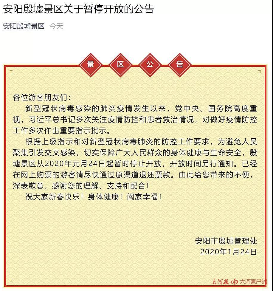 1月24日,大河报·大河客户端记者从中国文字博物馆、安阳市殷墟管理处等单位获悉,因新型冠状病毒感染的肺炎疫情发生,各单位暂时停止开放,开放时间另行通知。殷墟管理处发公告称,根据上级指示和对新型冠状病毒肺炎的防控工作要求,为避免人员聚集引发交叉感染,切实保障广大人民群众的身体健康与生命安全,殷墟景区从2020年1月24日起暂时停止开放,开放时间另行通知。已经在网上购票的游客请尽快通过原渠道退还票款。