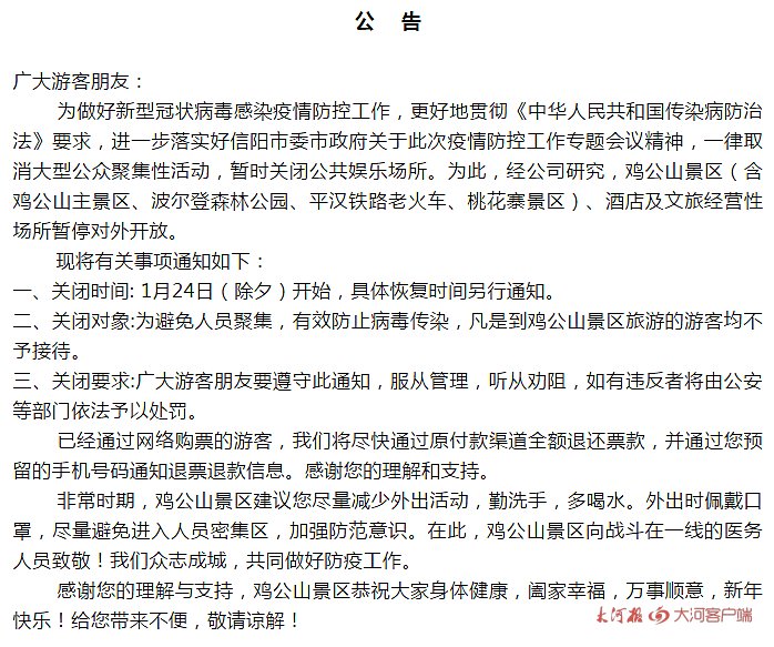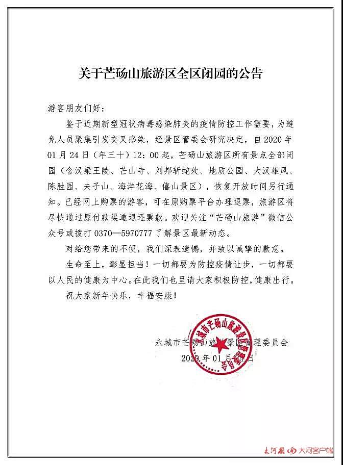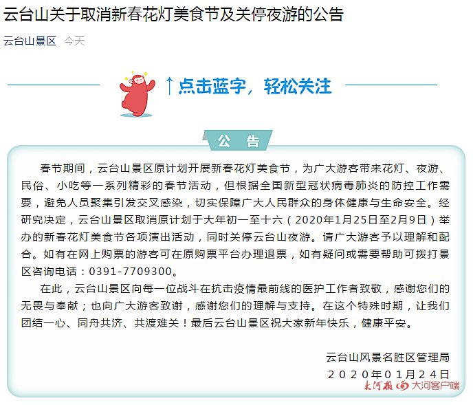 根据新型冠状病毒疫情防控工作最新需要,切实保障游客的安全与健康,洛阳龙潭大峡谷景区、洛阳荆紫仙山景区决定,自2020年1月24日(腊月三十)起暂停开放,并停止一切春节文化活动,恢复开放时间另行通知。