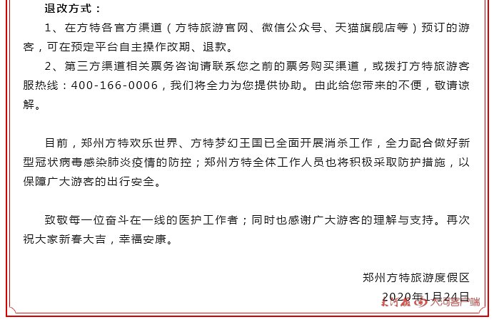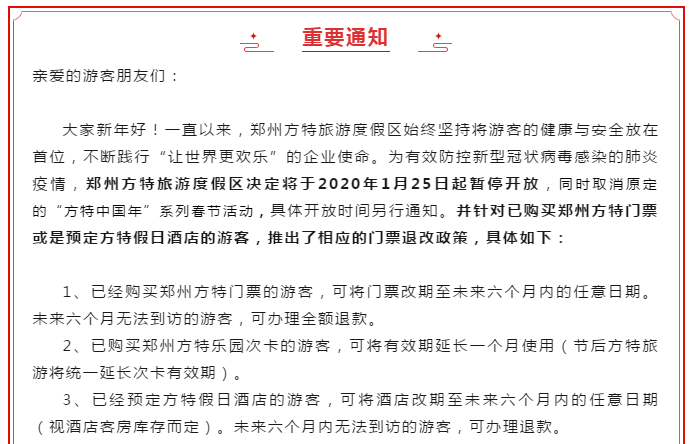 郑州银基冰雪世界、黄帝宫御温泉临时闭园,客房可改签可退款 根据疫情防控工作需要,银基国际旅游度假区决定:自2020年1月24日(大年三十)16:00起,度假区旗下在营项目银基冰雪世界、银基黄帝宫御温泉临时闭园,恢复开放时间另行通知。已购买银基冰雪世界门票、银基黄帝宫御温泉门票、银基黄帝宫御温泉酒店客房的游客,可通过“退票、改签绿色通道”将门票、客房改期至2020年6月30日前的任何日期(客房需视库存而定);2020年6月30日前不能到访的游客,可办理全额退款,可通过之前的购买渠道进行更改或取消操作。如有任何问题,可拨打度假区全国客服热线 4000-178-178。 郑州方特旅游度假区暂停开放,门票酒店均可退改 为有效防控新型冠状病毒感染的肺炎疫情,郑州方特旅游度假区决定将于2020年1月25日起暂停开放,同时取消原定的“方特中国年”系列春节活动,具体开放时间另行通知。并针对已购买郑州方特门票或是预定方特假日酒店的游客,推出了相应的门票退改政策。