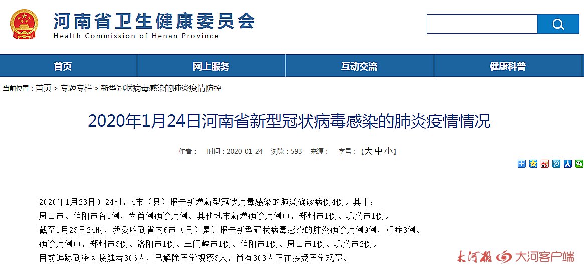 最新消息:截至1月23日24时,我省6市(县)累计报告新型冠状病毒感染的肺炎确诊病例9例,重症病例1例,无死亡病例。其中:确诊病例中,郑州市3例、洛阳市1例、三门峡市1例、信阳市1例、周口市1例、巩义市2例;重症病例中,周口市1例。目前追踪到密切接触者306人,已解除医学观察3人,尚有303人正在接受医学观察。