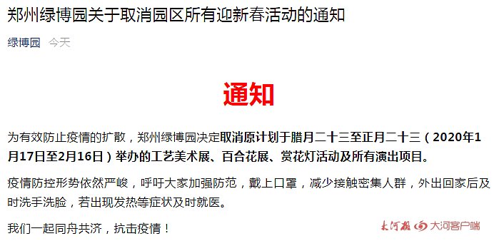 郑州园博园取消新春灯会、新春文化活动为有效防止疫情的扩散,郑州园博园决定原计划于正月初一至正月二十三(2020年1月25日至2月16日)举办的新春灯会及民俗演绎活动、打铁花、特色小吃等系列文化活动取消。 郑州绿博园取消园区所有迎新春活动 为有效防止疫情的扩散,1月24日,郑州绿博园发布通知,决定取消原计划于腊月二十三至正月二十三(2020年1月17日至2月16日)举办的工艺美术展、百合花展、赏花灯活动及所有演出项目。