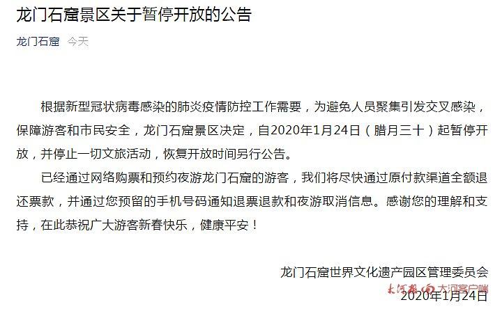 根据新型冠状病毒感染的肺炎疫情防控工作需要,为避免人员聚集引发交叉感染,保障游客和市民安全,龙门石窟景区决定,自2020年1月24日(腊月三十)起暂停开放,并停止一切文旅活动,恢复开放时间另行公告。 已经通过网络购票和预约夜游龙门石窟的游客,我们将尽快通过原付款渠道全额退还票款,并通过您预留的手机号码通知退票退款和夜游取消信息。