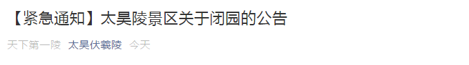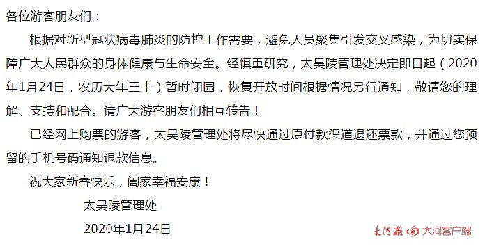 周口太昊陵景区暂时闭园,网上购票可退款 根据对新型冠状病毒肺炎的防控工作需要,为切实保障广大人民群众的身体健康与生命安全。太昊陵管理处决定即日起(2020年1月24日,农历大年三十)暂时闭园,恢复开放时间根据情况另行通知,敬请您的理解、支持和配合。请广大游客朋友们相互转告!已经网上购票的游客,太昊陵管理处将尽快通过原付款渠道退还票款,并通过您预留的手机号码通知退款信息。 同时,周口鹿邑县人民政府办公室也发布了太清宫、明道宫景区的必园公告。