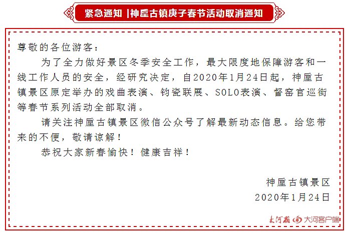 禹州神垕古镇景区庚子春节活动取消 为了全力做好景区冬季安全工作,最大限度地保障游客和一线工作人员的安全,经研究决定,自2020年1月24日起,神垕古镇景区原定举办的戏曲表演、钧瓷联展、SOLO表演、督窑官巡街等春节系列活动全部取消。