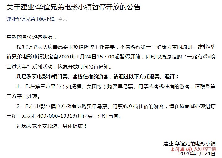今天中午,根据新型冠状病毒感染的疫情防控工作需要,建业•华谊兄弟电影小镇决定自2020年1月24日15:00起暂停开放,同时取消原定的“一路有戏•喷空过大年”系列活动,恢复开放时间另行通知。凡通过网络平台购买电影小镇门票、客栈住宿的游客,请通过原渠道平台退票、退订。