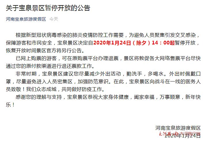 根据新型冠状病毒感染的肺炎疫情防控工作需要,为避免人员聚集引发交叉感染,保障游客和市民安全,宝泉景区决定自2020年1月24日(除夕)14:00起暂停开放,恢复开放时间景区官方将另行公告。已网上购票的游客,可在原购票平台办理退票,景区将敦促各大网络售票平台尽快通过您的原付款渠道进行退还票款工作。