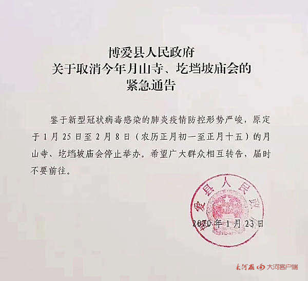 鉴于近期新型冠状病毒感染的肺炎疫情形势,青天河风景名胜区管理局发布:为保障广大游客过一个平安祥和的新春佳节,按照博爱县人民政府要求,原定于1月25日至2月8日(农历正月初一至正月十五)的月山寺庙会停止举办,同时,博爱县圪垱坡庙会也停止举办。