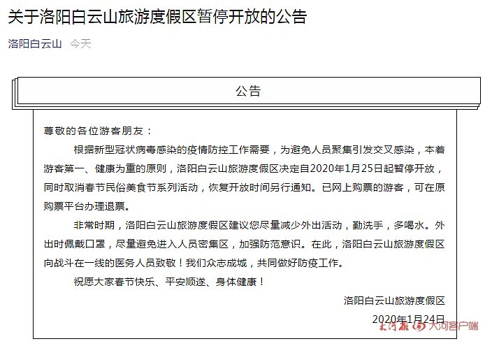 根据新型冠状病毒感染的疫情防控工作需要,为避免人员聚集引发交叉感染,本着游客第一、健康为重的原则,洛阳白云山旅游度假区决定自2020年1月25日起暂停开放,同时取消春节民俗美食节系列活动,恢复开放时间另行通知。已网上购票的游客,可在原购票平台办理退票。