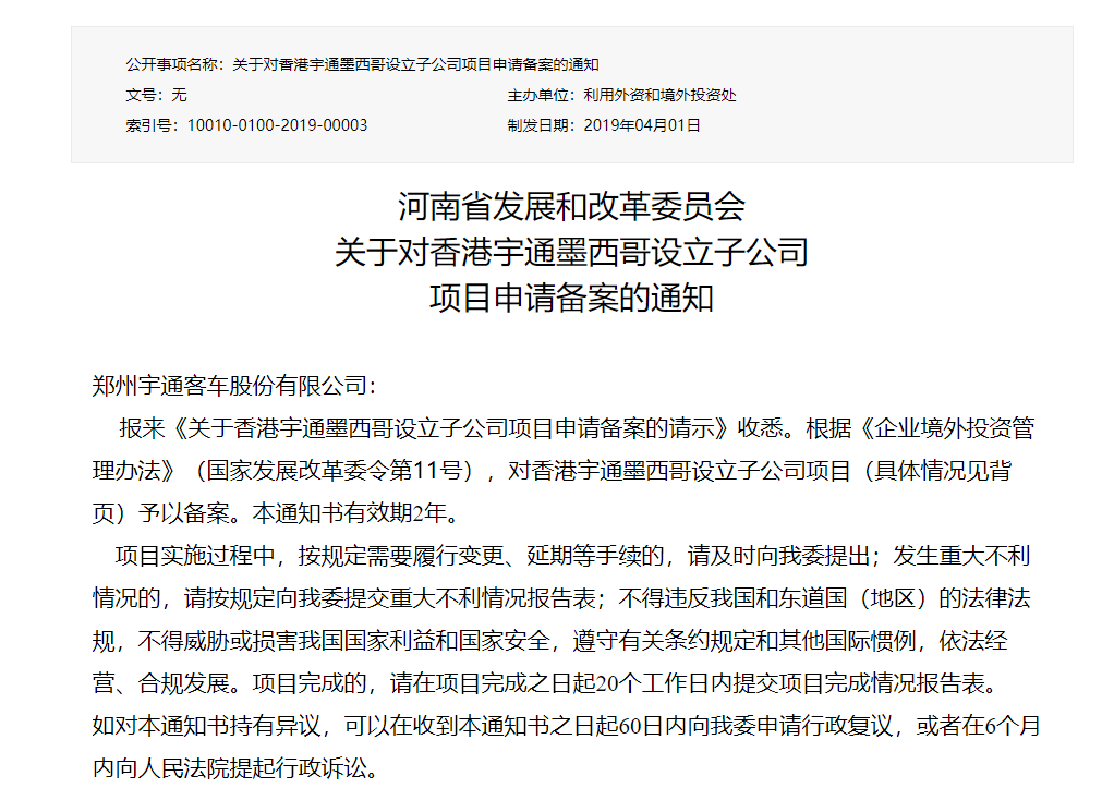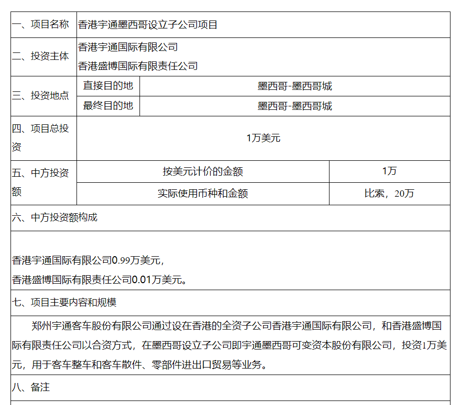 总投资1万美元!宇通客车设立墨西哥子公司获河南省发改委备案