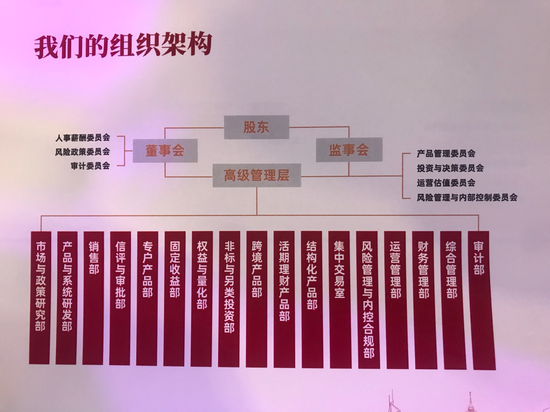 从组织架构来看,中银理财下设17个部门,分别为市场与政策研究部、产品与系统研发部、销售部、信评与审批部、专户产品部、固定收益部、权益与量化部、非标与另类资产投资部、跨境产品部、活期理财产品部、结构化产品部、集中交易室、风险管理与内控合规部、运营管理部、财务管理部、综合管理部、审计部。