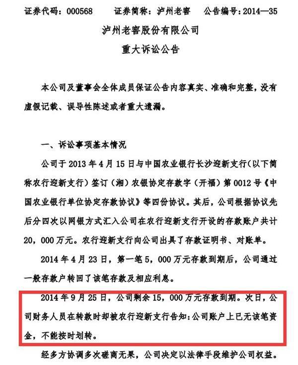 由此才有了2014年10月15日,泸州老窑对外发布《重大诉讼公告》,公司存于农行的1.5亿存款失踪。