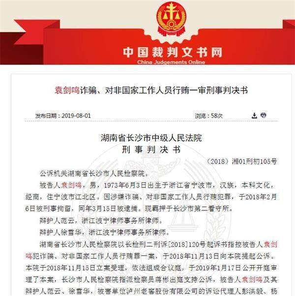 法院一审判决,被告人袁剑鸣犯诈骗罪,犯对非国家工作人员行贿罪;合并执行有期徒刑17年,剥夺政治权利5年,并处罚金人民币420万元。继续追缴诈骗犯罪所得人民币1.5亿元发还被害人泸州老窖。其中,责令被告人袁剑鸣退赔犯罪所得人民币1.17亿元。