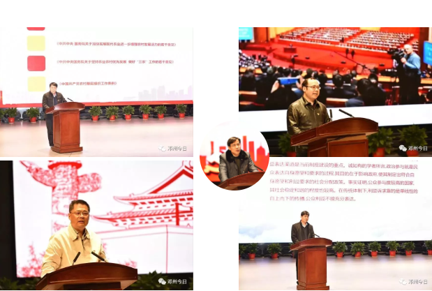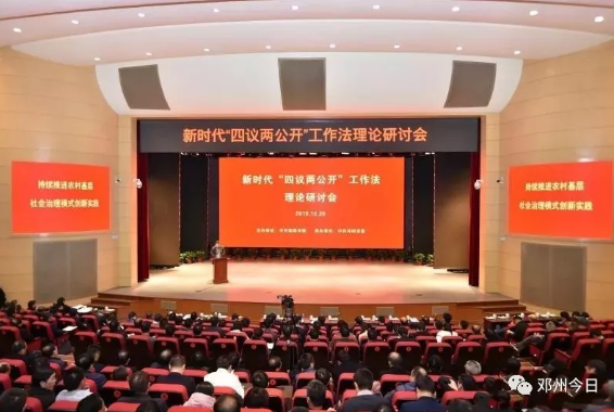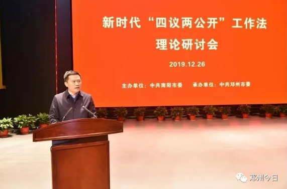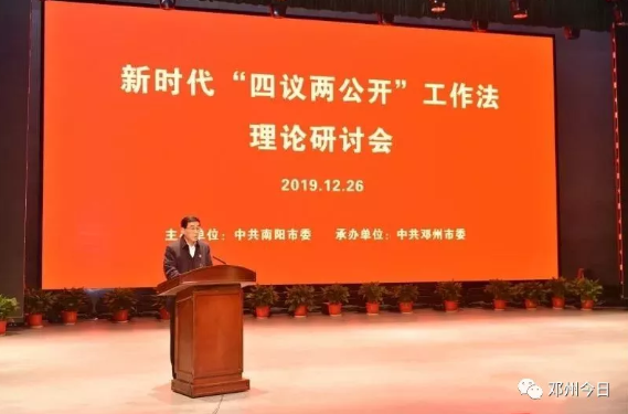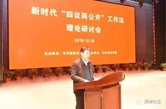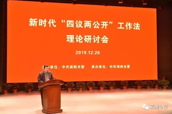 12月26日,新时代“四议两公开”工作法理论研讨会在邓州市举行,此次活动由南阳市委主办,邓州市委承办。中组部党建研究所副巡视员黄蓬勃,中组部组织二局六处处长金玉磊,中组部党建研究所副调研员陈秋贵,省委组织部二级巡视员、组织员李永,省委组织部二处处长王军祥,省民政厅副巡视员张正德、基层政权建设和社区治理处处长梁浩国,南阳市委书记张文深,南阳市委常委、组织部长吕挺琳,南阳市人大常委会副主任、邓州市委书记金浩,南阳理工学院党委书记邢勇,南阳市委党校党委副书记杨振保出席研讨会。