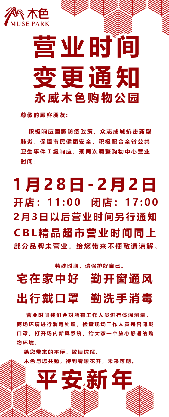 “明日起至2月2日,营业时间调整为上午11点至下午5点,CBL精品超市营业时间同上,具体恢复正常的营业时间另行通知。”1月27日下午,位于郑东新区的永威木色购物公园贴出营业时间变更的通告。
