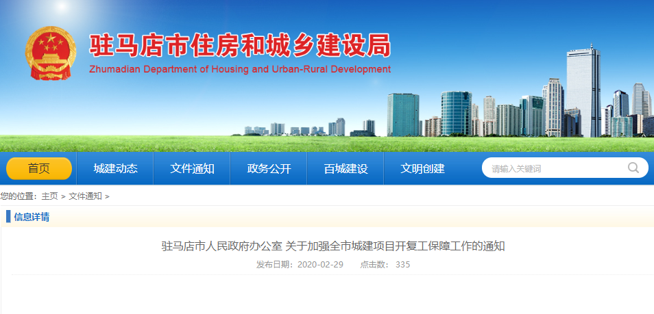 大河财立方消息 2月29日,据驻马店市住房与城乡建设局消息,日前,驻马店市人民政府办公室下发关于加强全市城建项目开复工保障工作的通知。通知明确,为统筹抓好疫情防控与经济社会秩序恢复,自本通知下发之日起, 驻马店市全市城建项目即可复工复产,不分时段、不分类型、应复尽复、全面复工。