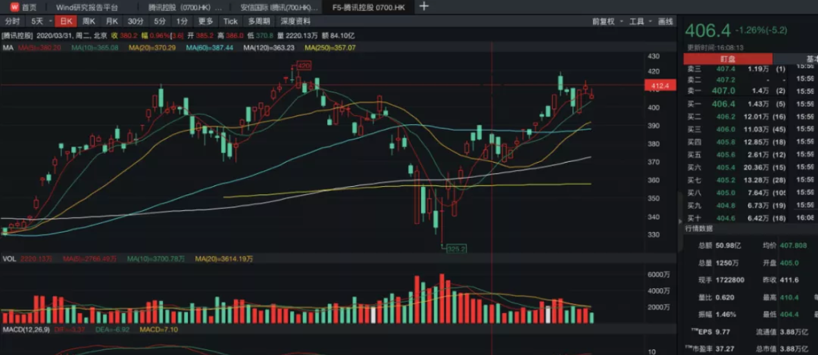 截至4月24日港股收盘,腾讯控股收盘价为406.4港元,小幅下跌1.26%,但是相比于自3月19日当天最低股价325.2港元/股的低点已经累计上涨约25%。