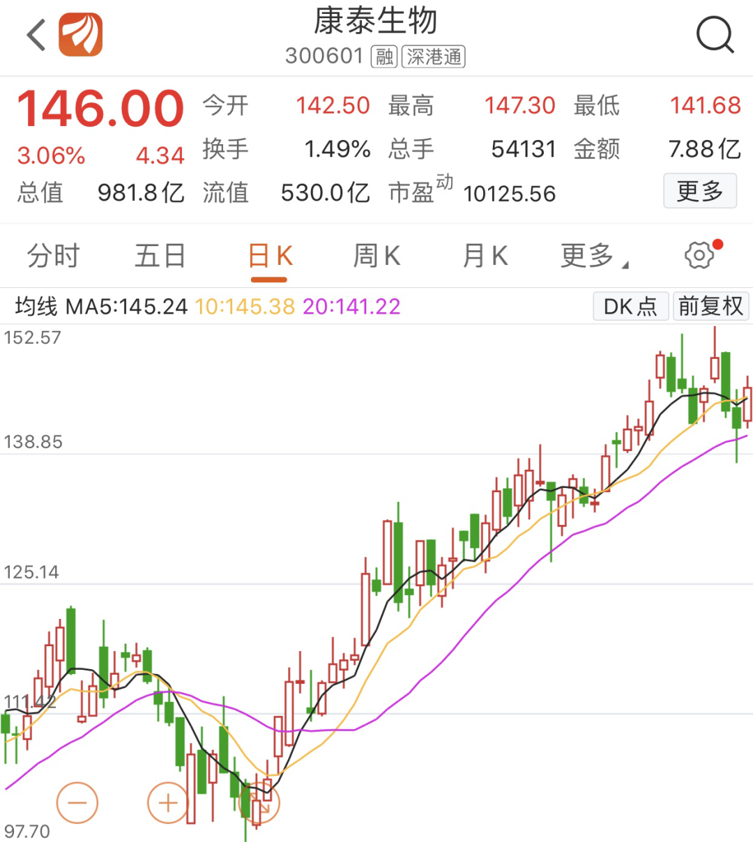 今年以来,康泰生物股价已涨近70%,总市值981.84亿元,接近千亿市值。