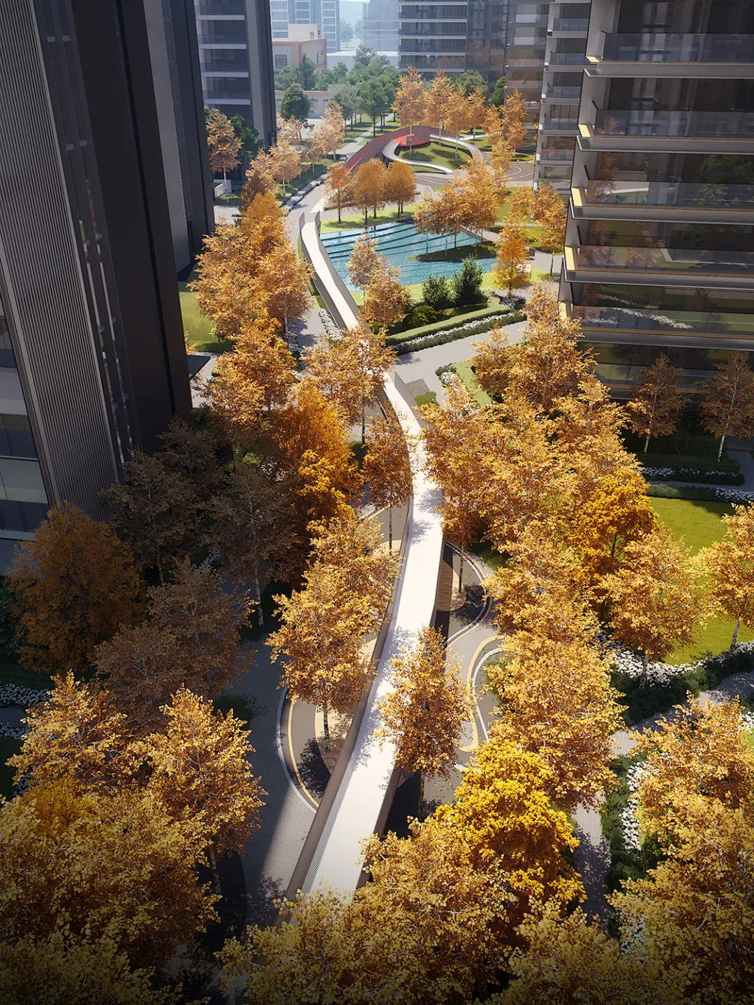 于场景营造上,约10000㎡中央会客园林及近1400㎡架空会客厅构建庭园式社区社交空间,鹅掌楸、乌桕、银杏、青桐形成四大风景,银杏林间六座景观桥串联六大主题游乐场,从而在时间与空间的双重维度,形成满足各生命周期需求的全维共享邻里社交场所,革新中原人居景观新标准。