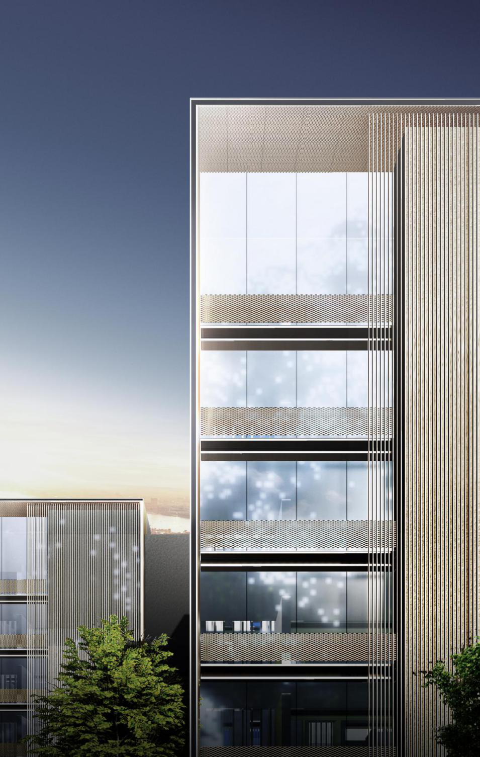 环幕玻璃与氟碳喷涂铝板的融合,匹配国际窗墙体系以达到历久弥新的艺术效果。同时大量采用透光率较高的超白玻,形成可媲美水晶的低调典雅、剔透奢华的美学效果。