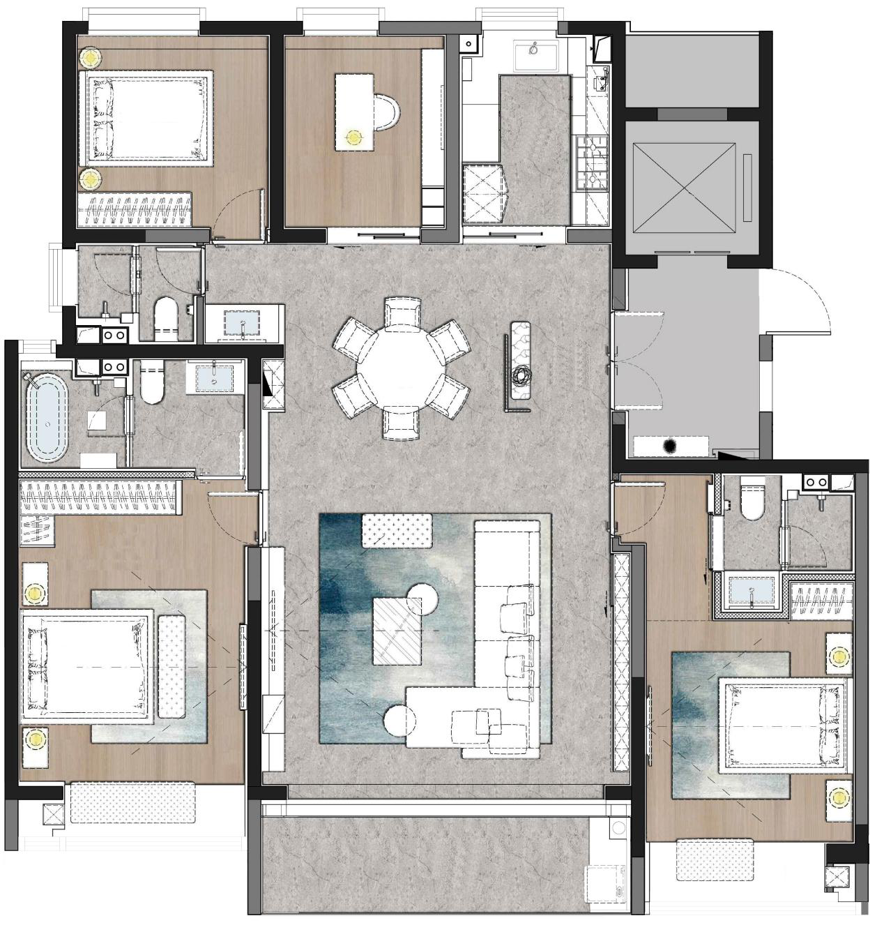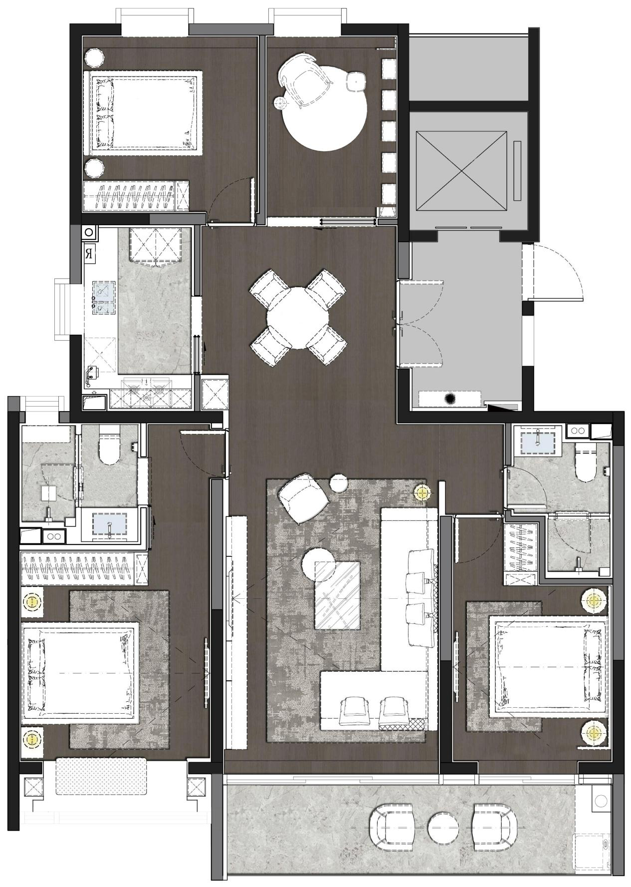 康桥香麓湾建筑面积约182㎡的环幕平墅产品,采用270°环幕转角设计,同时形成无廊流动空间,在直面贾鲁河湾水面胜境的方向,构建视野全打开的敞阔效果。