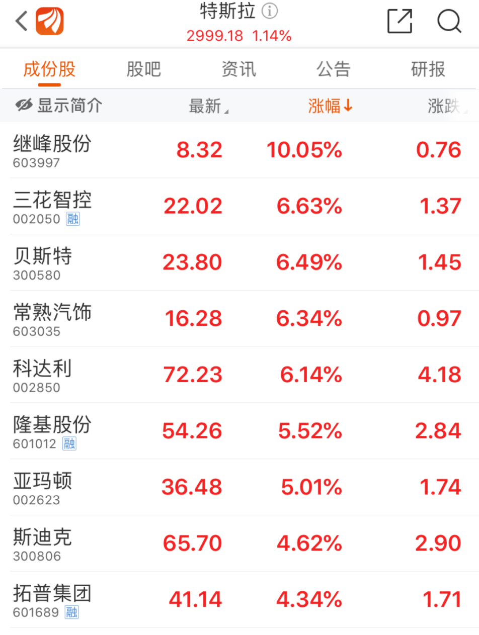 因此特斯拉的一举一动也影响着许多公司。截至8月21日午盘,东方财富数据显示,特斯拉板块走红,收涨1.08%,其中继峰股份、贝斯特、三花智控、隆基股份等领涨。