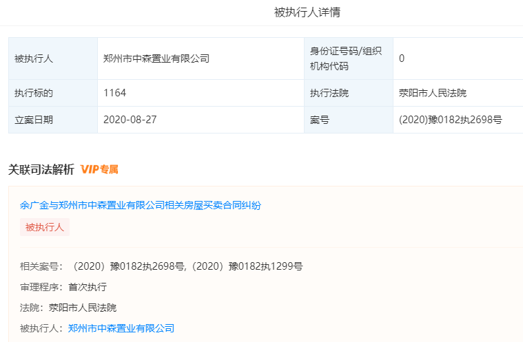 天眼查信息显示,郑州市中森置业有限公司成立于2002年9月,注册资本2亿元,主要经营范围为房地产开发与销售(凭资质证经营)等。大股东李中奎持股90%。法定代表人魏玉川持股6%。8月27日,该公司因未按时履行法律义务而被荥阳市人民法院强制执行。
