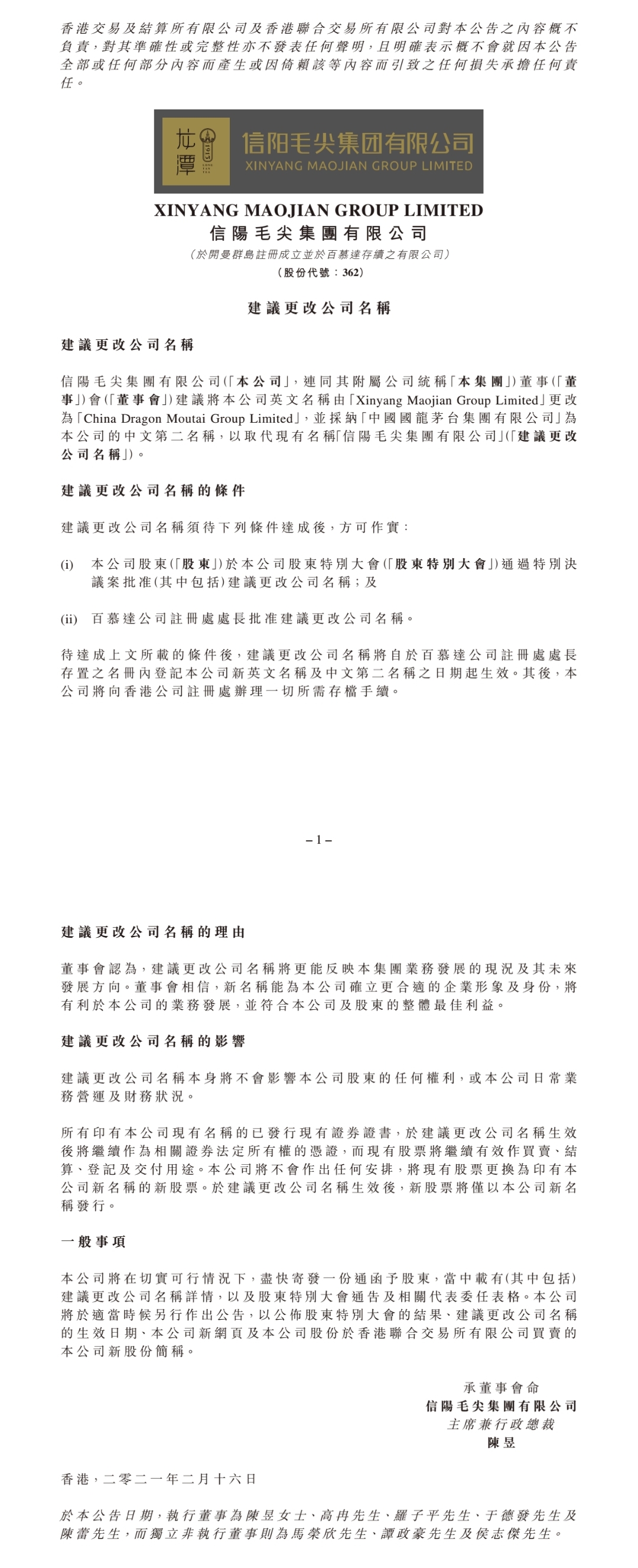 【大河财立方消息】2月16日,信阳毛尖发布公告,董事会建议将公司英文名称由“XinyangMaojianGroupLimited”更改为“ChinaDragonMoutaiGroupLimited”,并采纳“中国国龙茅台集团有限公司”为公司的中文第二名称,以取代现有名称”信阳毛尖集团有限公司“。