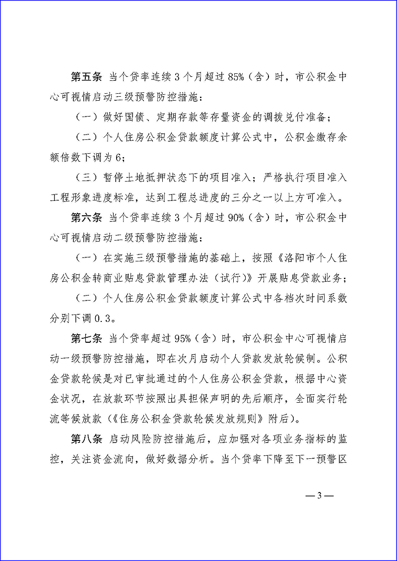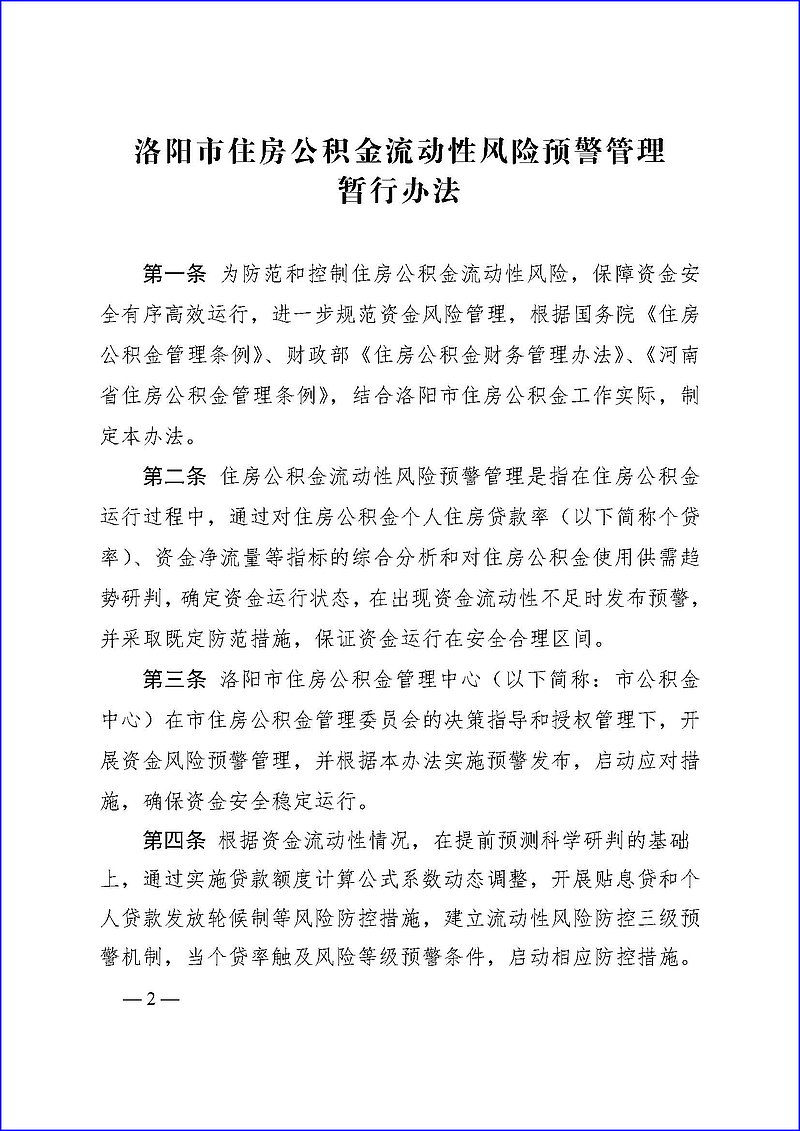 【大河财立方消息】日前,洛阳市住房公积金管理委员会出台《洛阳市住房公积金流动性风险预警管理暂行办法》,明确建立住房公积金流动性风险防控三级预警机制。办法调整了贷款额度计算公式系数,启动贴息贷款和个人贷款发放轮候制等。