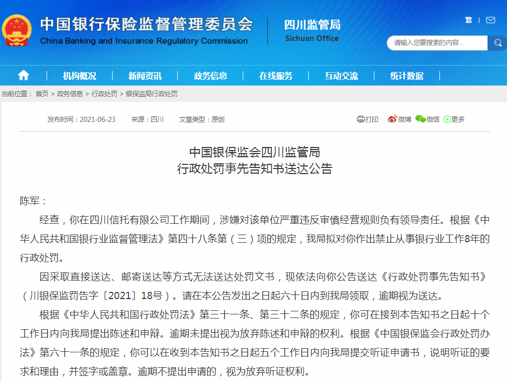 6月23日消息,据四川银保监局,因对四川信托严重违反审慎经营规则负有领导责任,原四川信托总裁陈军被禁止从事银行业工作8年。
