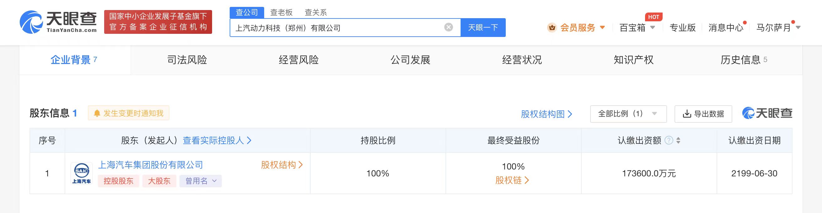 【大河财立方消息】天眼查App显示,近日,上汽动力科技(郑州)有限公司成立,法定代表人为吴冰,注册资本17.36亿人民币,经营范围含汽车零部件及配件制造、新能源汽车整车销售、电池制造、新材料技术研发、软件开发、检验检测服务等。股东信息显示,该公司由上海汽车集团股份有限公司全资持股。