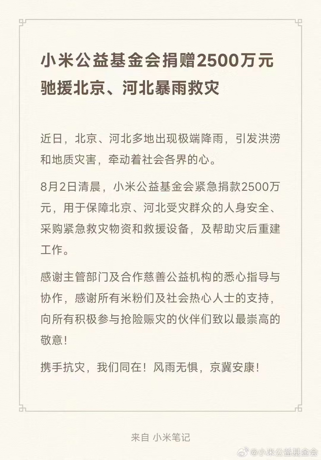 【大河财立方消息】近日,北京、河北多地出现极端降雨,引发洪涝和地质灾害,牵动着社会各界的心。8月2日清晨,小米公益基金会紧急捐款2500万元,用于保障北京、河北受灾群众的人身安全采购紧急救灾物资和救援设备,及帮助灾后重建工作。