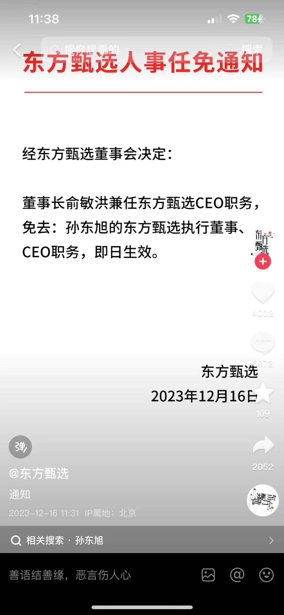 【大河财立方消息】12月16日,东方甄选发布人事任免通知,俞敏洪兼任东方甄选CEO,免去孙东旭CEO职务。