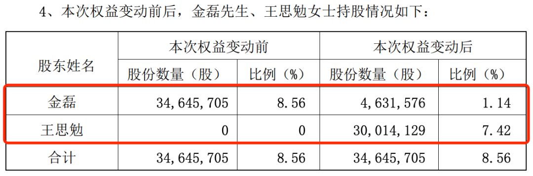 本次权益变动后,金磊持有公司约1.14%股份,不再是公司持股5%以上股东;王思勉持有公司约7.42%股份。