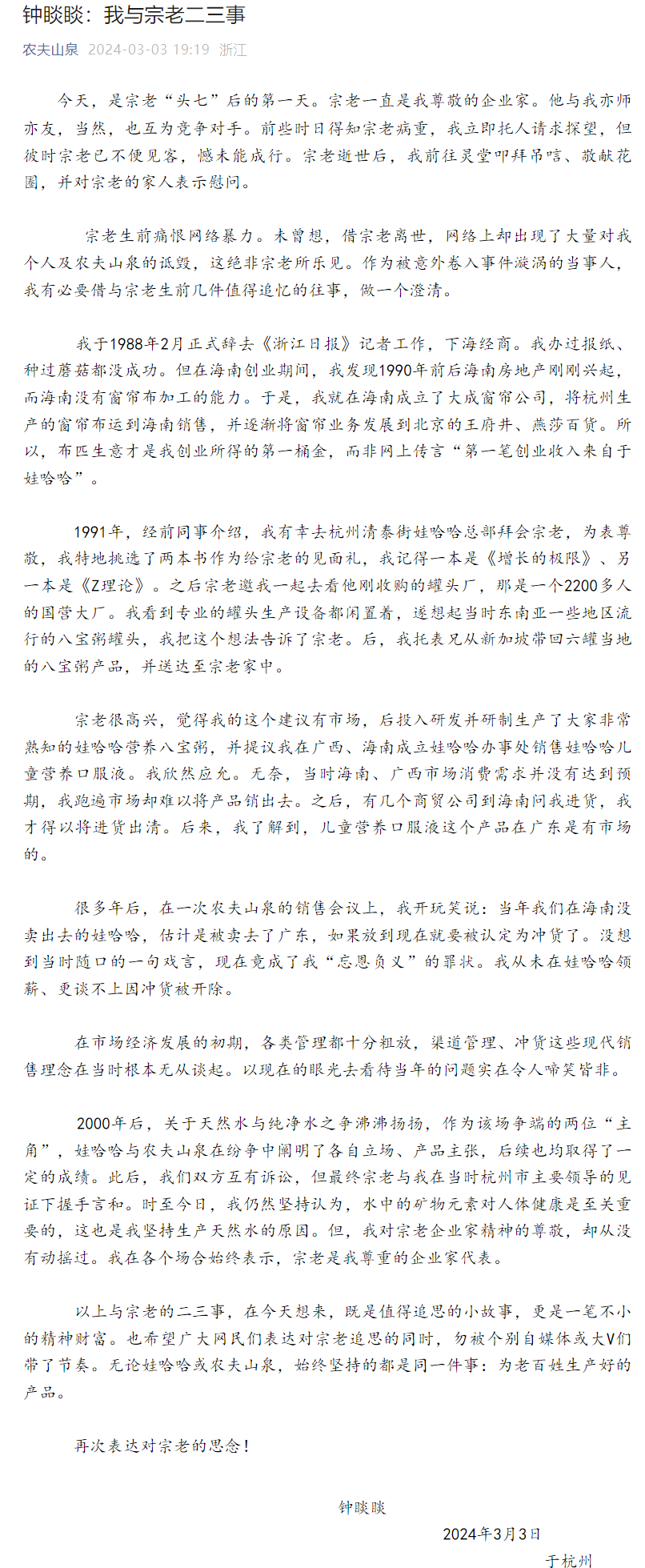 【大河财立方消息】3月3日晚间,农夫山泉公众号发布了“钟睒睒:我与宗老二三事”一文。