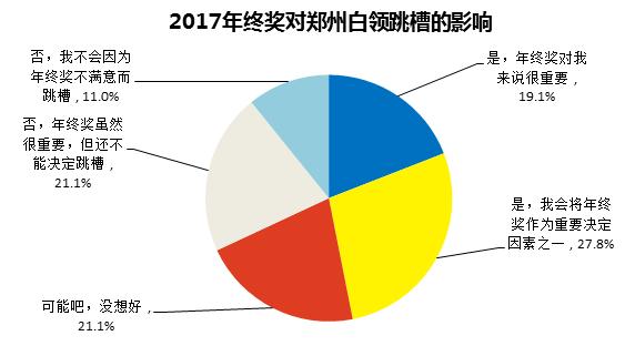 此外,值得企业家们注意的是,关于年终奖对跳槽的影响方面,郑州白领中有46.9%表示年终奖会对跳槽造成影响,这一水平较去年的34.6%上升了12%,但仍低于全国水平56.6%。另外,32.1%的郑州白领表示年终奖不会致使跳槽,21.1%的白领则表示未想好。