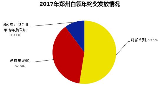 智联招聘此次调查显示,参与调查的郑州白领中有52.5%表示能够拿到年终奖,比2016年的35.8%有较大提升,但仍低于2017年全国平均水平66%。另外,有37.3%的郑州白领表示拿不到年终奖,有10.1%的白领表示,企业承诺年后发放。
