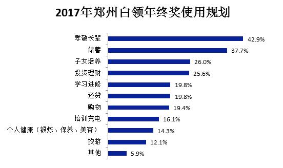 从调查中不难发现,对于如何使用年终奖,43%的郑州白领表示会用来孝敬长辈,其次是储蓄,占比为37.7%。另外,投资理财(25.6%)、子女培养(26%)也是郑州白领选择较多的年终奖使用方式。