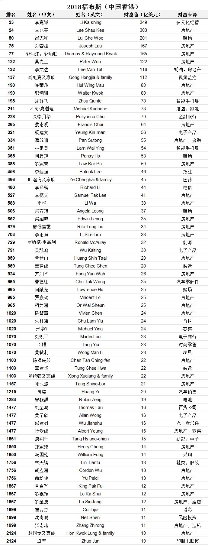 榜单上前200名,中国共有33位富豪上榜,其中内地21位,台湾1位,香港11位。房地产仍然是上榜富豪最多的行业,有11位。