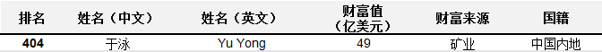 另外,值得一提的是,排在第404位的于泳以身家49亿美元上榜,榜单中其财富来源标注为矿业。于泳虽非河南富豪,却是豫股洛阳钼业的背后实控人。于泳持有洛阳钼业大股东之一鸿商集团99%的股权,押宝洛钼为其登上各类富豪榜奠定基础。