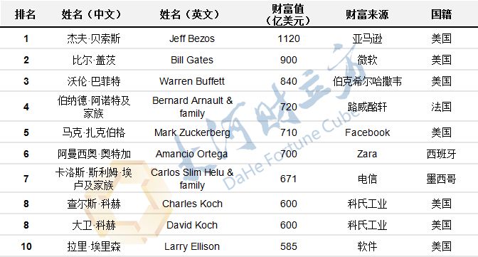 亚马逊的杰夫·贝索斯(Jeff Bezos)成为最新全球首富,这是他第一次成为全球首富,也是全球第一个个人财富超过1000亿美元的人。他的财富达到1120亿美元,比2017年增加392亿美元,这让他一举超过了昔日全球首富宝座常客比尔·盖茨。