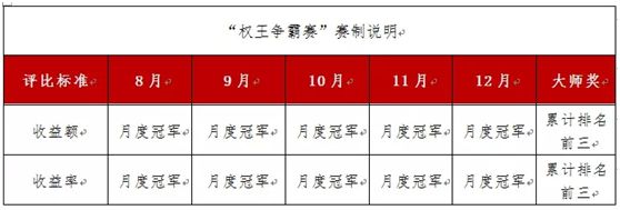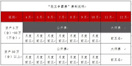 据了解,此次大赛分为“股王争霸赛”与“权王争霸赛”两场。其中“股王争霸赛”是按照资产高低划分,4月2日正式开赛;而“权王争霸赛”是按照收益额和收益率划分,将于今年8月开赛。
