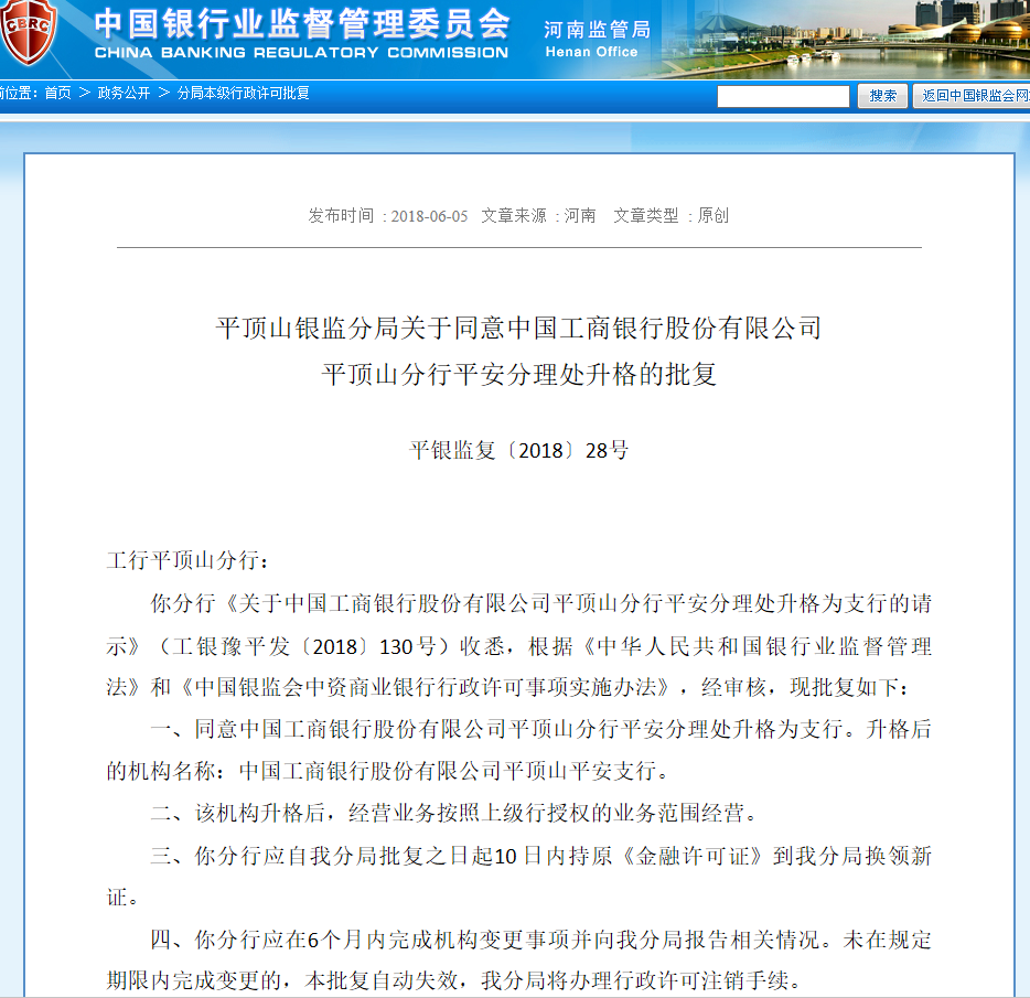 同意中国工商银行股份有限公司平顶山分行平安分理处升格为支行。升格后的机构名称:中国工商银行股份有限公司平顶山平安支行。