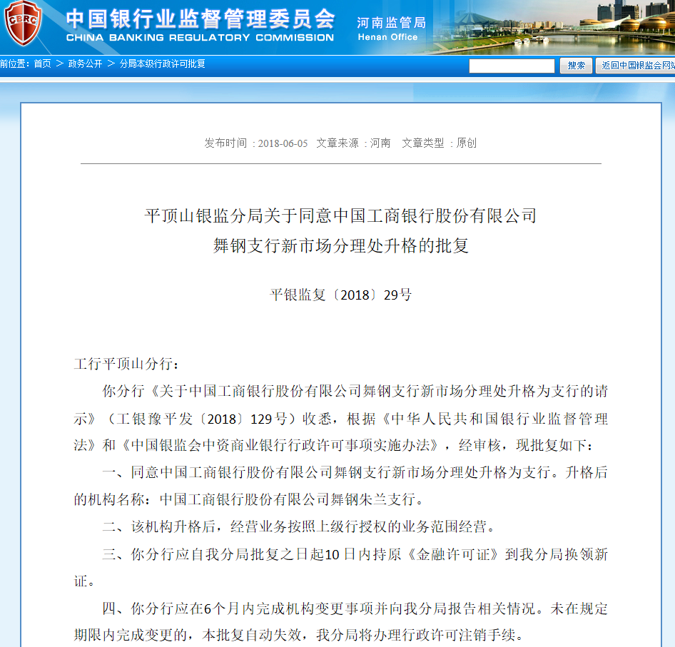 同意中国工商银行股份有限公司舞钢支行新市场分理处升格为支行。升格后的机构名称:中国工商银行股份有限公司舞钢朱兰支行。