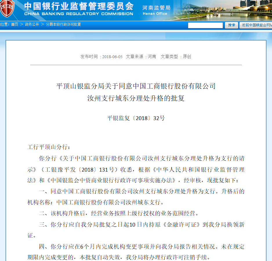 同意中国工商银行股份有限公司汝州支行城东分理处升格为支行。升格后的机构名称:中国工商银行股份有限公司汝州城东支行。
