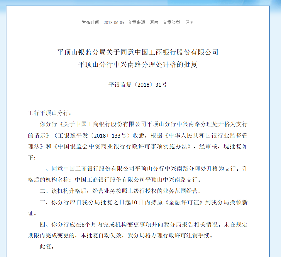 同意中国工商银行股份有限公司平顶山分行中兴南路分理处升格为支行。升格后的机构名称:中国工商银行股份有限公司平顶山中兴南路支行。