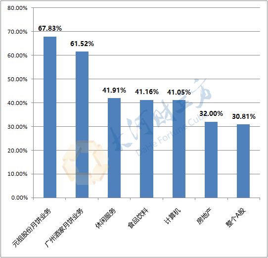 据Wind数据显示,2017年我国A股市场房地产行业上市公司(按申万行业分类,用平均法计算销售毛利率,下同)平均毛利率32.00%、计算机行业上市公司平均毛利率41.05%、食品饮料行业上市公司平均毛利率41.16%、休闲服务行业上市公司平均毛利率41.91%。整个A股上市公司平均毛利率30.81%。