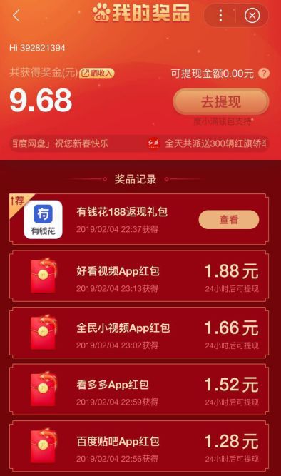 从大家晒出的百度红包来看,除了有现金红包,还有各类百度旗下产品如“有钱花”(消费信贷)/好看视频app/百度贴吧app/百度网盘等多个app的冠名红包: