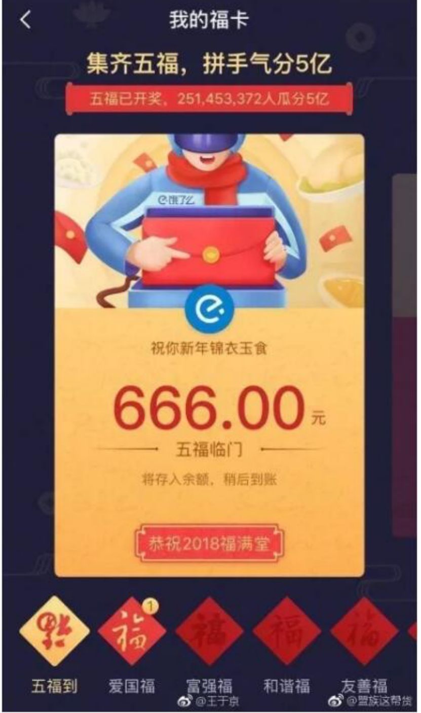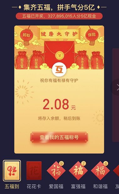 2016年,支付宝首次成为央视春晚独家互动合作平台。那年除夕当晚,支付宝一共拿出了8亿现金红包,除了多轮超1亿元的拼手气红包外,也在彼时推出了集福卡的活动,集齐五福的用户可共同平分2.15亿元现金红包。