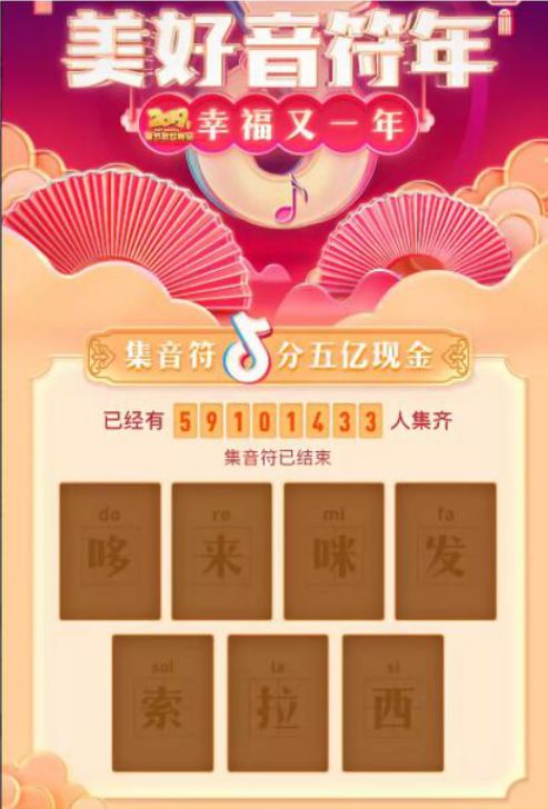 1月28日,抖音宣布上线“美好音符年”活动,凡是集齐“哆、来、咪、发、索、拉、西”七音符的用户皆可参与分享总计5亿元的红包,单个用户最高可获2019元。此外,抖音最新产品多闪也推出“发随拍、分一亿”活动,使用红包道具拍摄发送随拍,就能获得现金红包。